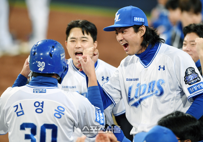 삼성 구자욱(가운데)이 25일 대구 삼성라이온즈파크에서 열린 2024 KBO리그 KIA와의 한국시리즈 3차전에서 부상으로 출전을 하지 못하는 가운데 5회말 1사 KIA 선발 라우어를 상대로 솔로 홈런을 친 김영웅과 함께 기뻐하고 있다. 2024. 10. 25.