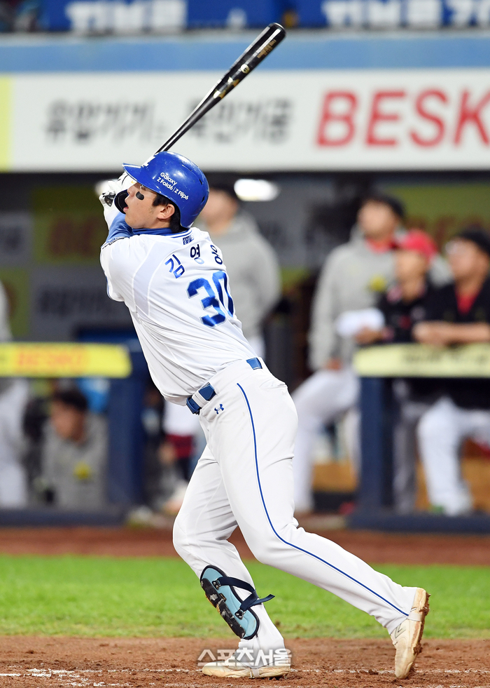 삼성 김영웅이 25일 대구 삼성라이온즈파크에서 열린 2024 KBO리그 KIA와의 한국시리즈 3차전 5회말 1사 KIA 선발 라우어를 상대로 솔로 홈런을 치고 있다. 2024. 10. 25.