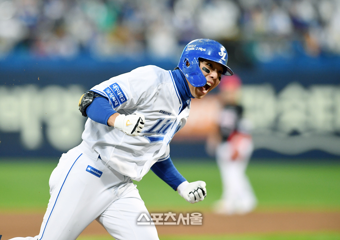 삼성 김영웅이 25일 대구 삼성라이온즈파크에서 열린 2024 KBO리그 KIA와의 한국시리즈 3차전 5회말 1사 KIA 선발 라우어를 상대로 솔로 홈런을 치고 환호하고 있다. 2024. 10. 25.