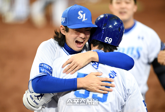 삼성 구자욱이 25일 대구 삼성라이온즈파크에서 열린 2024 KBO리그 KIA와의 한국시리즈 3차전에서 부상으로 출전하지 못하는 가운데 7회말 무사 김헌곤에 이어 연속 타자 홈런을 친 박병호와 포옹을 하며 기뻐하고 있다. 2024. 10. 25.