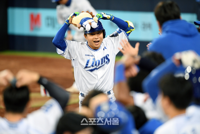 삼성 김헌곤이 25일 대구 삼성라이온즈파크에서 열린 2024 KBO리그 KIA와의 한국시리즈 3차전 7회말 무사 KIA 전상현을 상대로 솔로 홈런을 친 뒤 세리머니를 하고 있다. 2024. 10. 25.