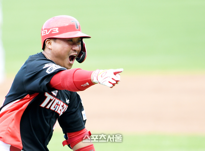 KIA 김태군이 26일 대구 삼성라이온즈파크에서 열린 2024 KBO리그 삼성과의 한국시리즈 4차전 3회초 2사 만루 상황에서 삼성 송은범을 상대로 만루 홈런을 친 뒤 기뻐하고 있다. 2024. 10. 26.