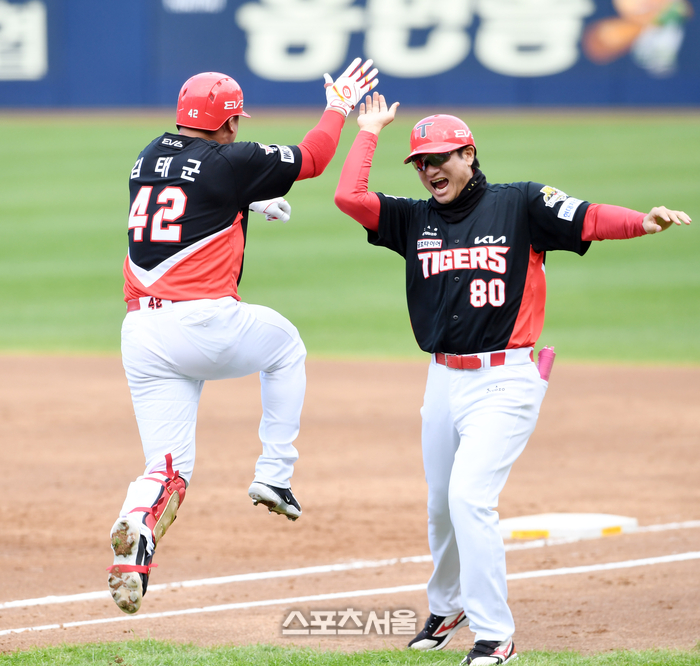 KIA 김태군이 26일 대구 삼성라이온즈파크에서 열린 2024 KBO리그 삼성과의 한국시리즈 4차전 3회초 2사 만루 상황에서 삼성 송은범을 상대로 만루 홈런을 친 뒤 이현곤 코치와 하이파이르를 하고 있다. 2024. 10. 26.