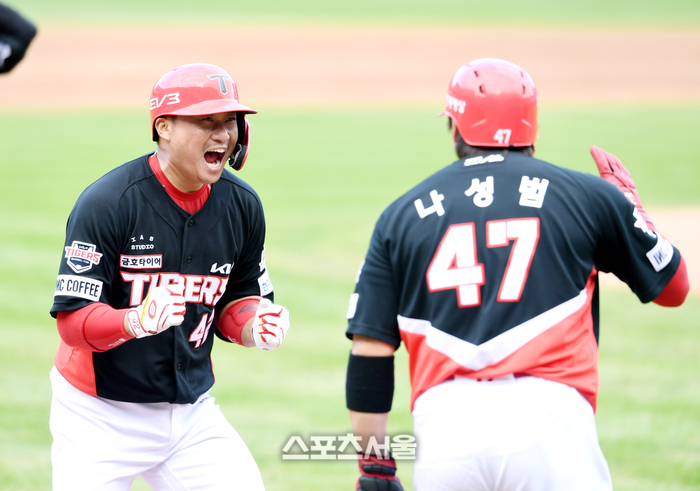 KIA 김태군(왼쪽)이 26일 대구 삼성라이온즈파크에서 열린 2024 KBO리그 삼성과의 한국시리즈 4차전 3회초 2사 만루 상황에서 삼성 송은범을 상대로 만루 홈런을 친 뒤 나성범과 함께 기뻐하고 있다. 2024. 10. 26.