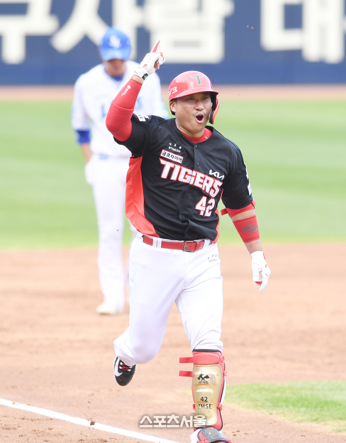홈런 순간 김태군은 그대로 벤치를 가리키며 환호했다. KIA 원정 관중들도 열광의 도가니. 흔들리던 삼성에 KO 펀치를 제대로 날렸다. 또한 삼성은 김태군의 친정이기도 하다.