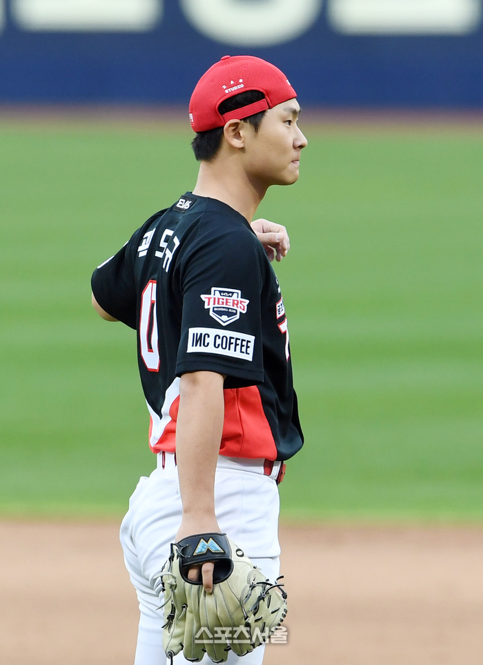 KIA 곽도규가 26일 대구 삼성라이온즈파크에서 열린 2024 KBO리그 삼성과의 한국시리즈 4차전 8회말 1사 1루 상황에서 삼성 디아즈를 상대로 병살타를 유도한 뒤 모자를 옆으로 쓰는 세리머니를 하고 있다. 2024. 10. 26.