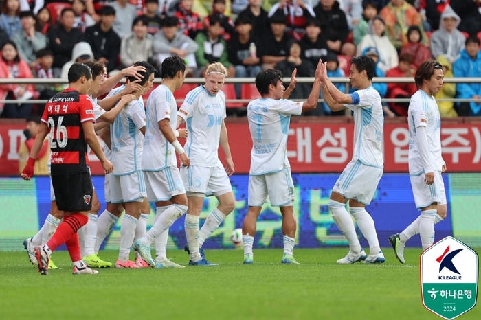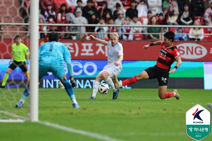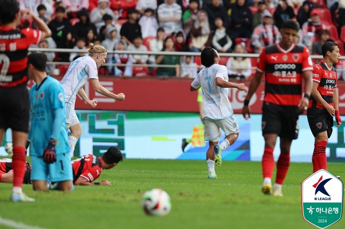 반면 역시 주중 ACLE 부리람(태국) 원정에서 0-1로 진 포항은 리그에서도 5경기 만에 패배를 안았다. 이날 후반 센터백 이규백이 다이렉트 퇴장하며 수적 열세에 몰린 게 컸다. 승점 52(14승10무11패)로 제자리걸음한 포항은 4위 FC서울(승점 53)을 넘어서지 못하며 5위를 지켰다.