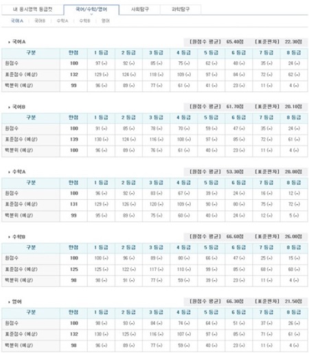 주요과목 1등급 커트라인은 국어 A형 129점, 국어 B형 130점, 수학 A형 129점, 수학 B형 125점, 영어 130점으로 조사됐다.