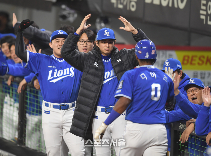 삼성 디아즈가 28일 광주-기아 챔피언스 필드에서 열린 KIA와 2024 KBO 한국시리즈 5차전 1회초 2사1루 우월홈런을 날린 후 동료들과 환호하고 있다.