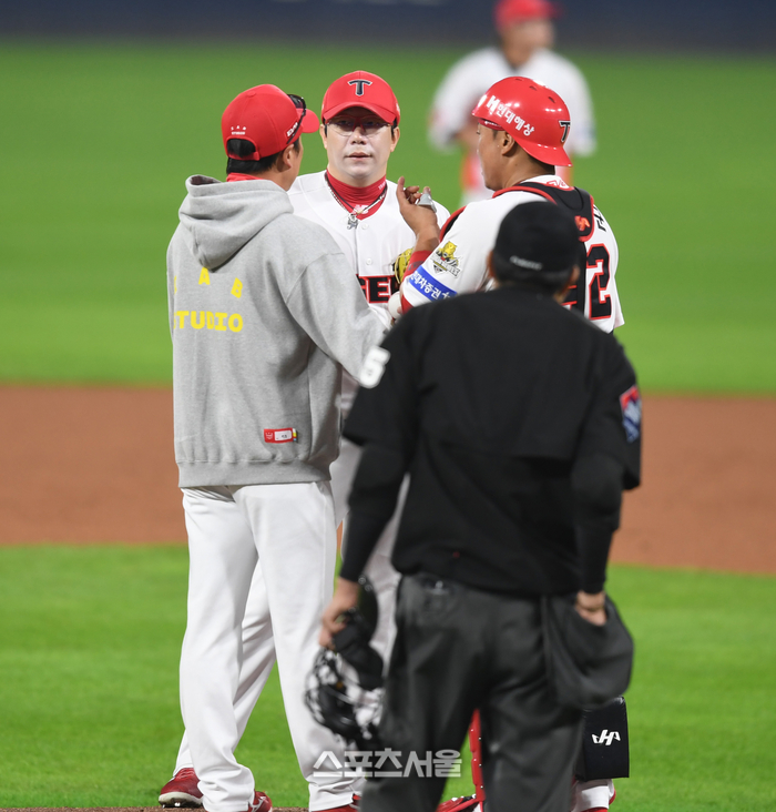 KIA 양현종이 28일 광주-기아 챔피언스 필드에서 열린 삼성과 2024 KBO 한국시리즈 5차전 1회 마운드를 방문한 정재훈 코치의 이야기를 듣고 있다.