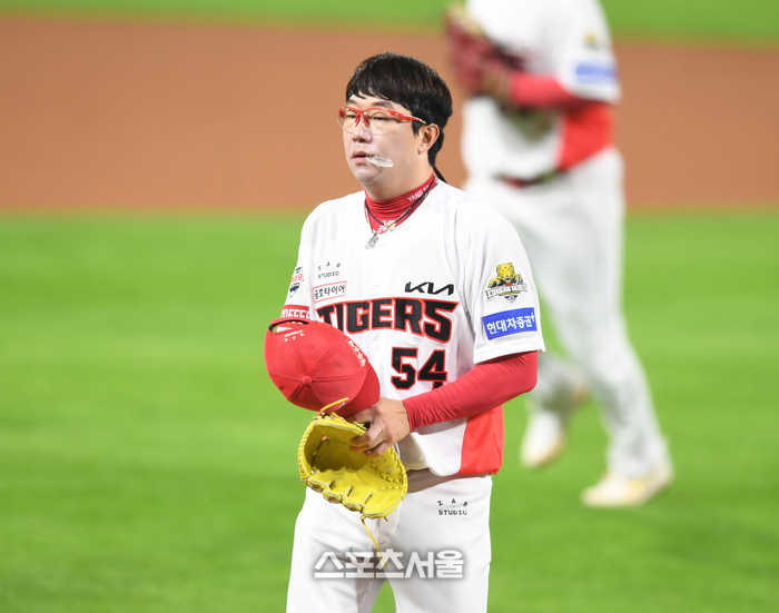 KIA 선발투수 양현종이 28일 광주-기아 챔피언스 필드에서 열린 삼성과 2024 KBO 한국시리즈 5차전 1회 투구 후 덕아웃으로 들어오고 있다.