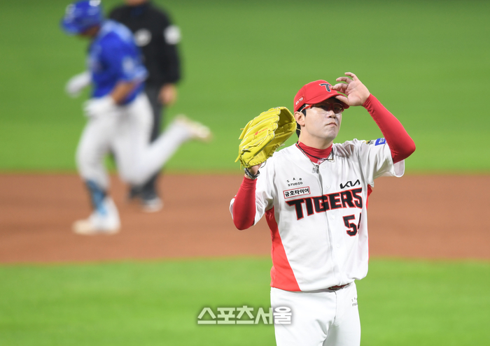 KIA 선발투수 양현종이 28일 광주-기아 챔피언스 필드에서 열린 삼성과 2024 KBO 한국시리즈 5차전 1회초 2사 상대 김영웅에 홈런을 허용한 후 허탈해하고 있다.