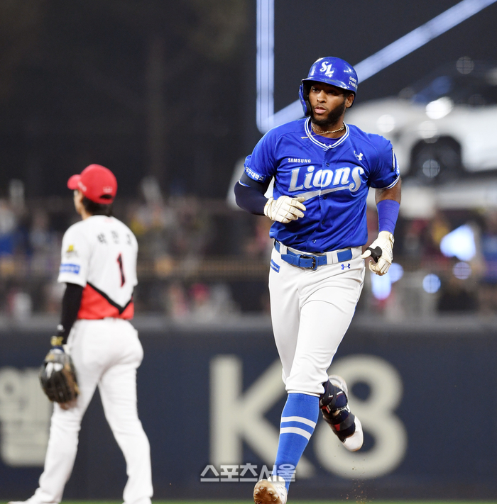 삼성 디아즈가 28일 광주-기아 챔피언스필드에서 열린 2024 KBO리그 KIA와의 한국시리즈 5차전 1회초 2사 1루 상황에서 KIA 선발 양현종을 상대로 선제 2점 홈런을 치고 베이스를 돌고 있다. 2024. 10. 28.