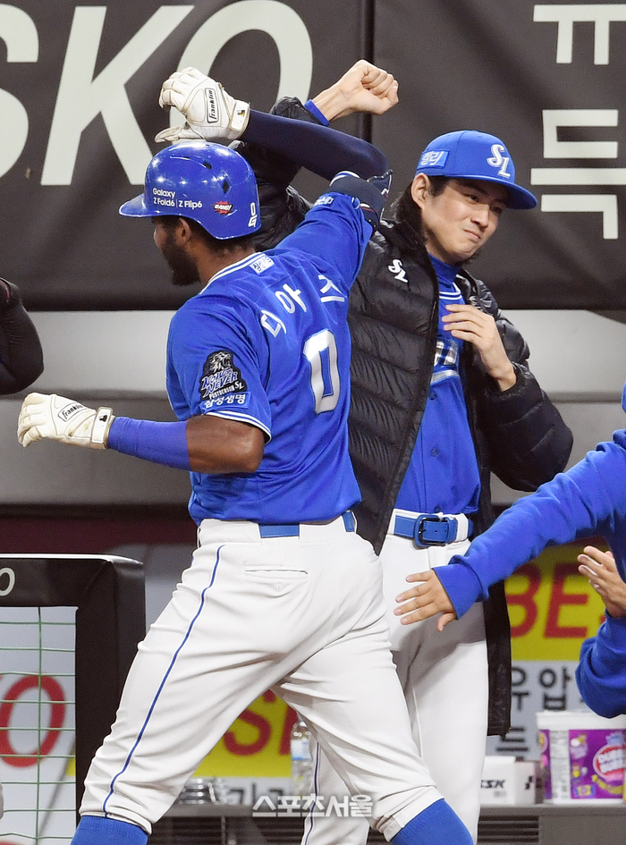 삼성 디아즈가 28일 광주-기아 챔피언스필드에서 열린 2024 KBO리그 KIA와의 한국시리즈 5차전 1회초 2사 1루 상황에서 KIA 선발 양현종을 상대로 선제 2점 홈런을 치고 구자욱과 하이파이브를 하고 있다. 2024. 10. 28.