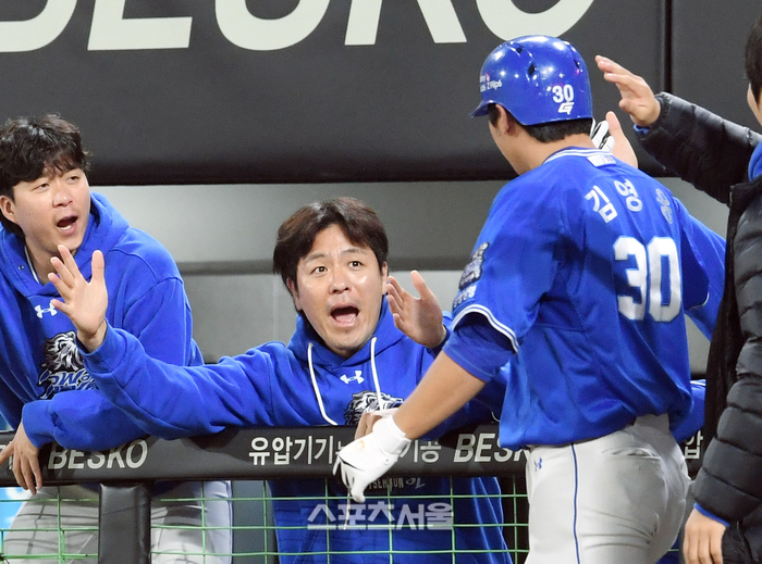 삼성 김영웅(오른쪽)이 28일 광주-기아 챔피언스필드에서 열린 2024 KBO리그 KIA와의 한국시리즈 5차전 1회초 2사 KIA 선발 양현종을 상대로 디아즈에 이어 백투백 홈런을 친 뒤 강민호(가운데)와 하이파이브를 하고 있다. 2024. 10. 28.