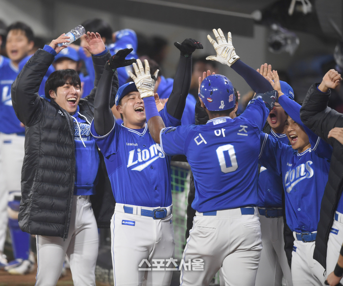 삼성 디아즈가 28일 광주-기아 챔피언스 필드에서 열린 KIA와 2024 KBO 한국시리즈 5차전 3회초 2사1루 우월홈런을 날린 후 환호하고 있다.