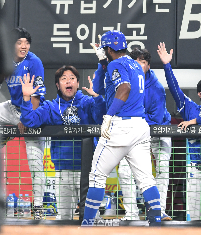 삼성 디아즈가 28일 광주-기아 챔피언스필드에서 열린 2024 KBO리그 KIA와의 한국시리즈 5차전 3회초 2사 1루 상황에서 KIA 선발 양현종을 상대로 2점 홈런을 치고 강민호와 하이파이브를 하고 있다. 1회에 이은 디아즈의 연타석 홈런. 2024. 10. 28.