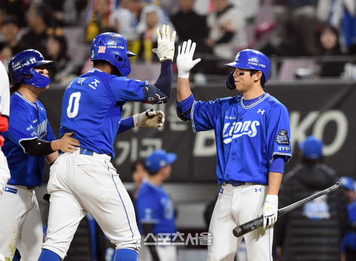 삼성 디아즈(왼쪽)가 28일 광주-기아 챔피언스필드에서 열린 2024 KBO리그 KIA와의 한국시리즈 5차전 3회초 2사 1루 상황에서 KIA 선발 양현종을 상대로 2점 홈런을 치고 김영웅과 하이파이브를 하고 있다. 1회에 이은 디아즈의 연타석 홈런. 2024. 10. 28.