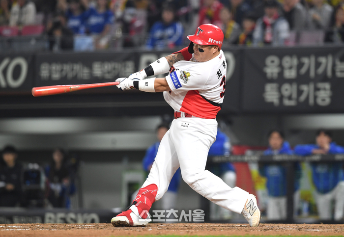 KIA 최형우가 28일 광주-기아 챔피언스필드에서 열린 2024 KBO리그 삼성과의 한국시리즈 5차전 5회말 무사 삼성 김태훈을 상대로 솔로 홈런을 치고 있다. 2024. 10. 28.
