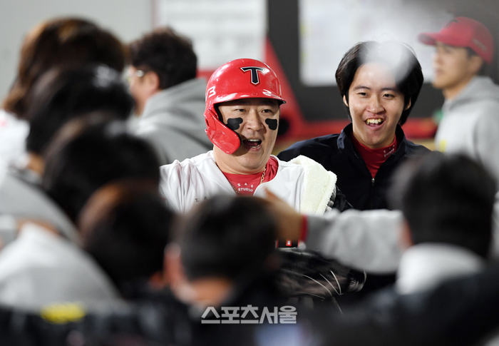 KIA 최형우가 28일 광주-기아 챔피언스필드에서 열린 2024 KBO리그 삼성과의 한국시리즈 5차전 5회말 무사 삼성 김태훈을 상대로 솔로 홈런을 치고 동료들과 함께 세리머니를 하고 있다. 2024. 10. 28.