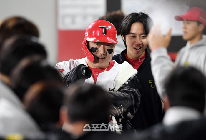 KIA 최형우가 28일 광주-기아 챔피언스필드에서 열린 2024 KBO리그 삼성과의 한국시리즈 5차전 5회말 무사 삼성 김태훈을 상대로 솔로 홈런을 치고 동료들과 함께 세리머니를 하고 있다. 2024. 10. 28.