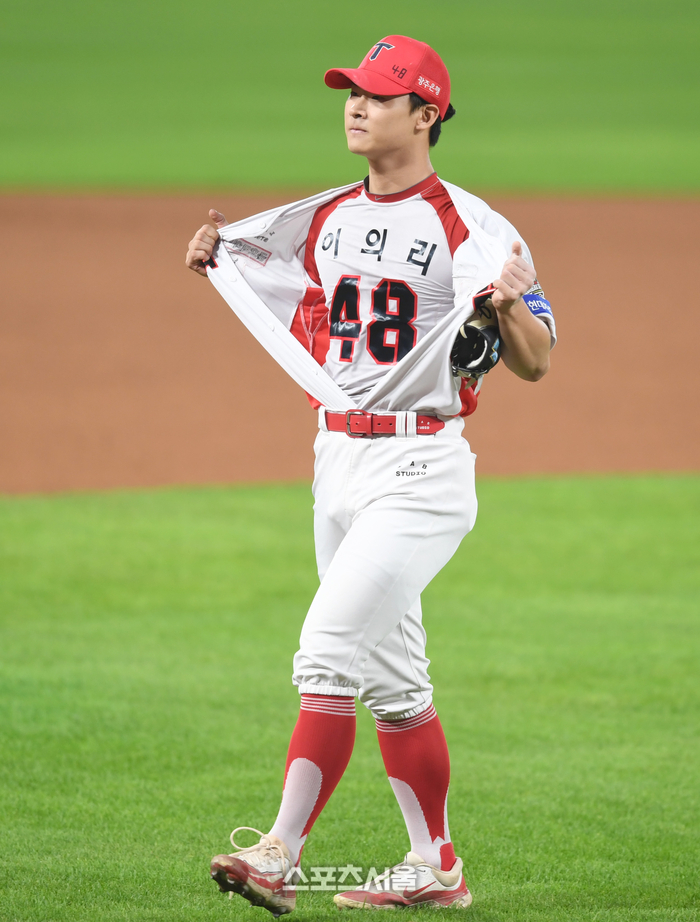 KIA 투수 곽도규가 28일 광주-기아 챔피언스 필드에서 열린 삼성과 2024 KBO 한국시리즈 5차전 6회 투구 후 덕아웃으로 들어오며 이의리 유니폼을 보여주고 있다.