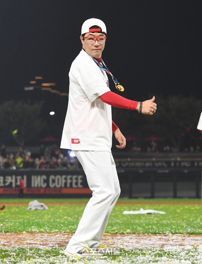 KIA 양현종이 28일 광주-기아 챔피언스필드에서 열린 2024 KBO리그 삼성과의 한국시리즈 5차전에 삼성을 꺾고 시리즈 전적 4승 1패로 우승을 차지한 뒤 ‘삐끼삐끼’춤을 추고 있다. 2024. 10. 28.