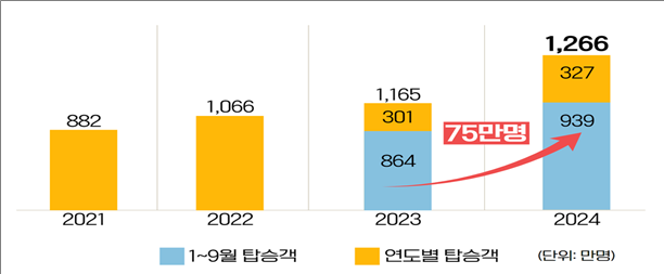 지난 9월까지 이용객은 939만명으로 전년 동기 대비 75만 명이 증가했으며, 춘천시에 따르면 올해 연말까지 전체 이용객은 작년 대비 101만 명이 늘어난 1,266만 명이 될 것으로 예측된다.