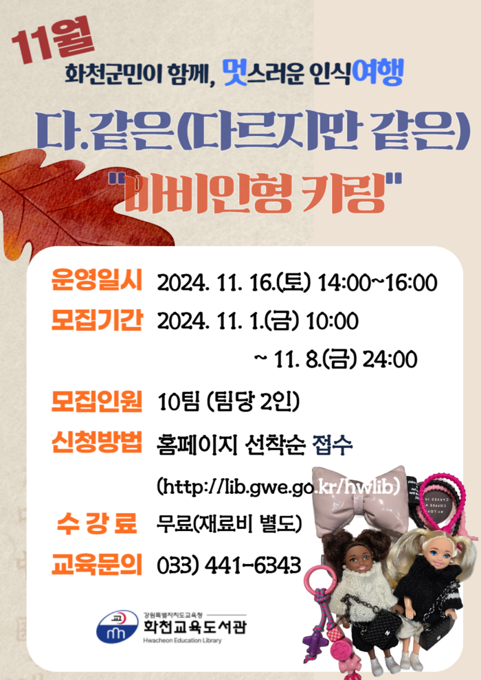 [스포츠서울ㅣ김기원기자]강원특별자치도화천교육도서관(관장 양재현)은 군민을 대상으로 2024년 11월 평생학습 주말 특강 「멋스러운 인식여행, “다.같은 바비인형 키링 만들기”」를 운영한다.