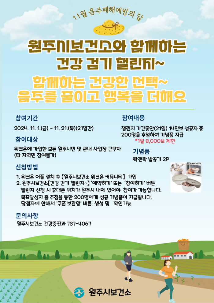 [스포츠서울ㅣ원주=김기원기자]원주시보건소는 11월 음주폐해예방의 달을 맞이하여 보건소와 함께하는‘건강 걷기 챌린지’를 진행한다.