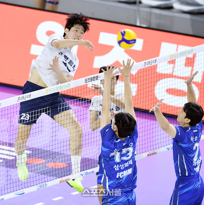 대한항공 김민재(왼쪽)가 31일 인천 계약체육관에서 열린 2024-2025 V리그 남자부 삼성화재와 경기에서 속공을 하고 있다. 2024. 10. 31.