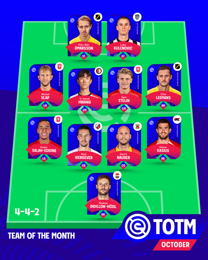 네덜란드 에레디비시는 1일(한국시간) 공식 채널을 통해 10월 ‘이달의 팀’을 발표했다. 4-4-2로 구성된 전형이다.