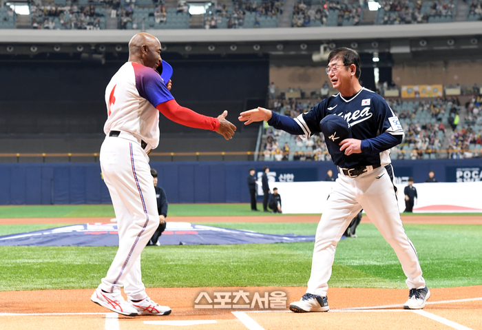대한민국 야구 대표팀의 류중일 감독(오른쪽)이 2일 고척스카이돔에서 열린 쿠바와 평가전에 앞서 쿠바의 아르만도 욘슨 감독과 악수를 하고 있다. 2024. 11. 2.