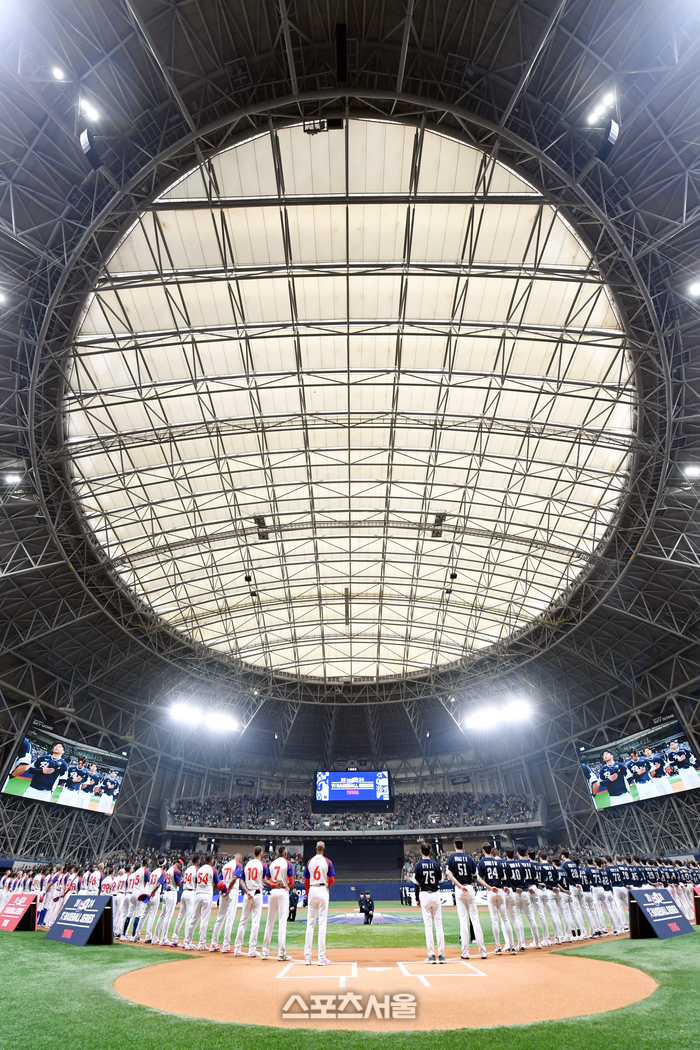 스포츠 | 야구 [포토]대한민국과 쿠바의 평가전 열리는 고척스카이돔 입력2024-11-02 14:38:47 북마크 페이스북 트위터 SNS 더보기 가글자크기설정 인쇄 SNS 더보기 닫기 네이버밴드 네이버블로그 URL복사 글자크기 설정 메뉴 닫기 글자크기 설정 시 다른 기사의 본문도동일하게 적용됩니다. 가 가 가 가 가 2일 고척스카이돔에서 열린 대한민국과 쿠바의 야구대표팀 2차 평가전에 앞서 양 팀 선수단이 국민의례를 하고 있다. 2024. 11. 2.고척 | 박진업 기자 upandup@sportsseoul.com 기사추천 0