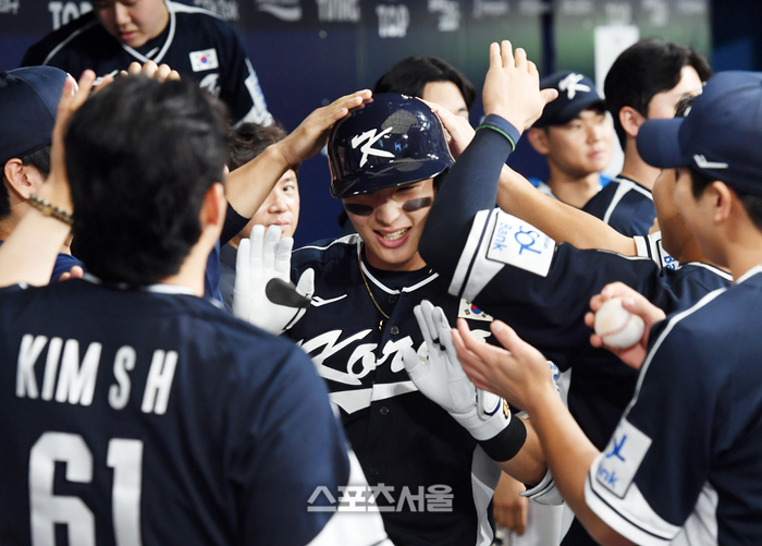 대한민국 야구 대표팀의 윤동희(가운데)가 2일 고척스카이돔에서 열린 쿠바와 2차 평가전 2회초 무사 쿠파의 피게레도를 상대로 선제 솔로 홈런을 치고 동료들과 하이파이브를 하고 있다. 2024. 11. 2.