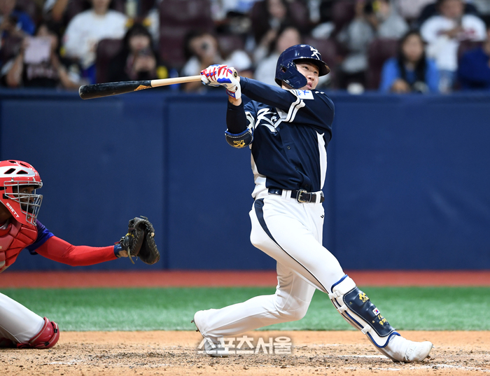 대한민국 야구 대표팀의 최원준이 2일 고척스카이돔에서 열린 쿠바와 2차 평가전 8회초 1사 1-2루 상황에서 쿠바 투수 마우리스를 상대로 2타점 2루타를 치고 있다. 2024. 11. 2.
