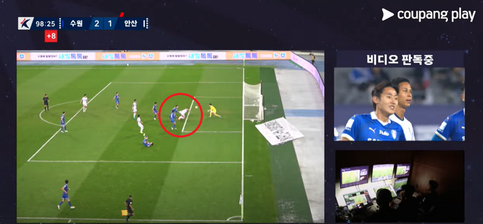 오른쪽 측면에서 연결된 크로스를 안산 공격수 강수일이 몸을 날려 헤더로 연결하려던 찰나에 수원 수비수 조윤성이 유니폼을 강하게 당겼다. 강수일은 당기는 힘으로 인해 넘어졌지만, 주심은 휘슬을 불지 않았다. VAR을 실시한 후에도 판정은 달라지지 않았다. 굳이 느린 그림이 아닌 정상적인 재생 속도로 봐도 워낙 강하게 잡아 진로에 명백한 영향을 미쳤기 때문에 ‘성향’이라는 이유로 그냥 넘어가기엔 무리인 동작이었다.