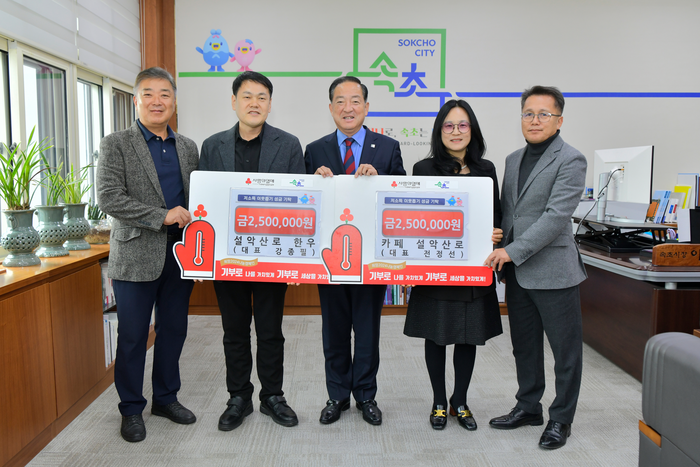 [스포츠서울ㅣ김기원기자]설악산로 한우(대표 강종필)와 카페 설악산로(대표 전정선)는 11월 4일 속초시청을 방문하여 각 250만 원씩 총 5백만 원을 대포동 희망나눔기금으로 기탁했다.