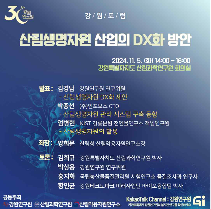 [스포츠서울ㅣ춘천=김기원기자]강원연구원(원장 현진권)은 강원특별자치도 산림과학연구원, 산림청 산림약용자원연구소 등 공동으로 2024년 11월 05일(화) 14시 산림과학연구원 에서 “산림생명산업의 산업화를 위한 디지털트랜스포메이션”포럼을 개최한다.