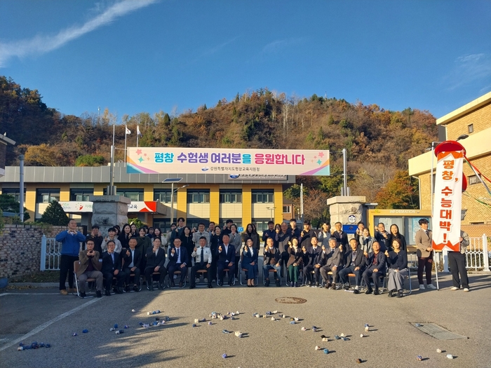 이날 교육지원청, 평창군청, 평창군의회 등 지역과 평창 교육가족이 한자리에 모여 2025학년도 대학수학능력시험에 응시하는 평창 관내 수험생들을 응원했다.
