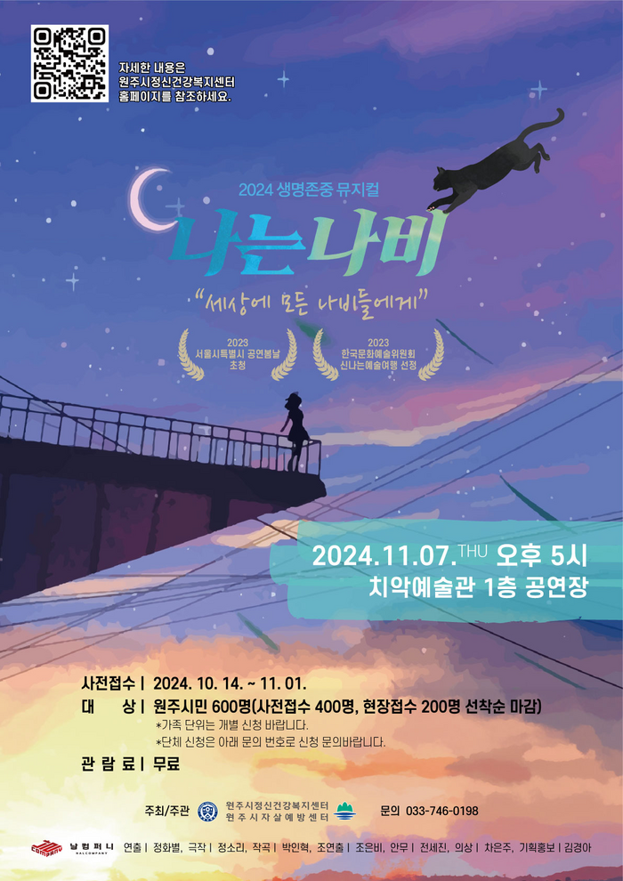 [스포츠서울ㅣ원주=김기원기자]원주시자살예방센터는 오는 7일(목) 치악예술관 1층 공연장에서 생명존중 뮤지컬 ‘나는 나비’ 공연을 진행한다.