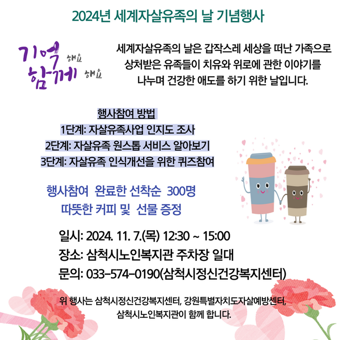 [스포츠서울ㅣ김기원기자]삼척시정신건강복지센터는 세계 자살유족의 날을 맞이하여 11월 7일 강원특별자치도자살예방센터, 삼척시노인복지관과 함께 자살유족의 날 행사를 운영한다.