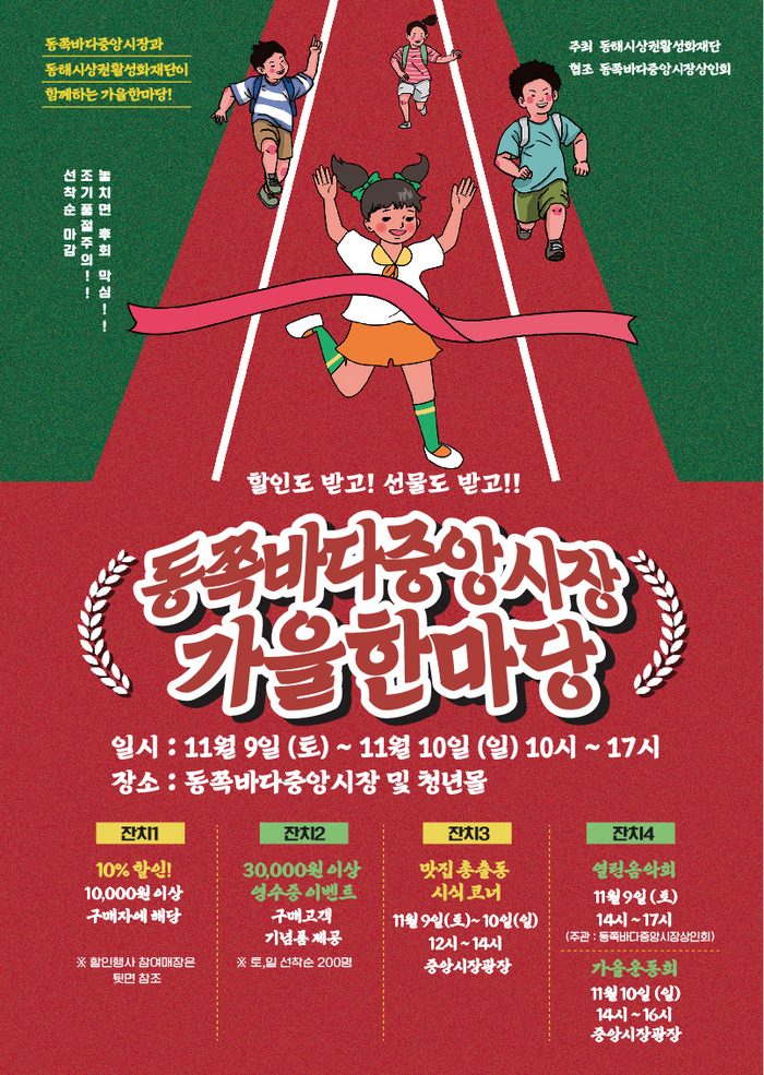 [스포츠서울ㅣ김기원기자](재)동해시상권활성화재단(이사장 문영준, 이하 재단)은 동쪽바다중앙시장상인회와 협력하여 오는 11월 9일(토)부터 10일(일)까지 2일간 할인과 다양한 이벤트가 함께하는 ‘2024년 동쪽바다중앙시장 가을한마당’을 개최한다.