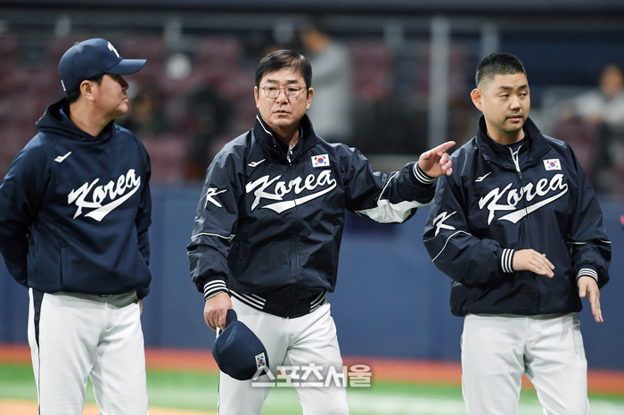 대한민국 야구 대표팀의 류중일 감독(가운데)이 6일 고척스카이돔에서 열린 상무와의 평가전을 마친 뒤 상대팀과 인사를 하고 더그아웃으로 돌아가고 있다. 2024. 11. 6.