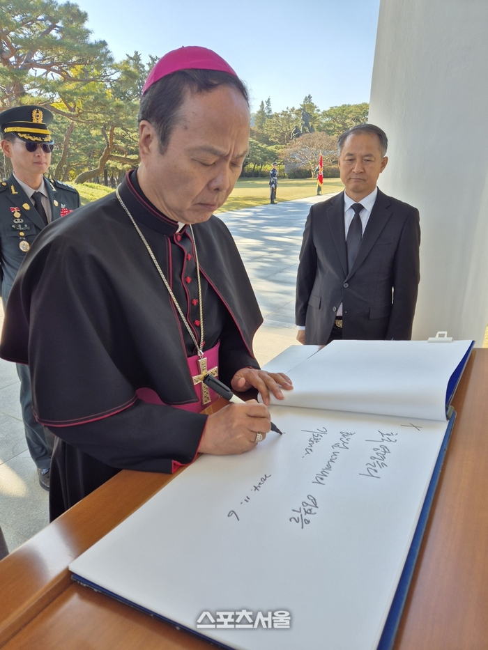 앞서 서 주교는 현충탑 참배 후 방명록에 ‘호국영령들의 하느님 나라에서의 영복을 기도합니다’라고 썼다. 이날 현충탑 참배와 합동 위령미사에는 군종교구 사제 90여 명을 비롯한 신자 250여 명이 참석했다.