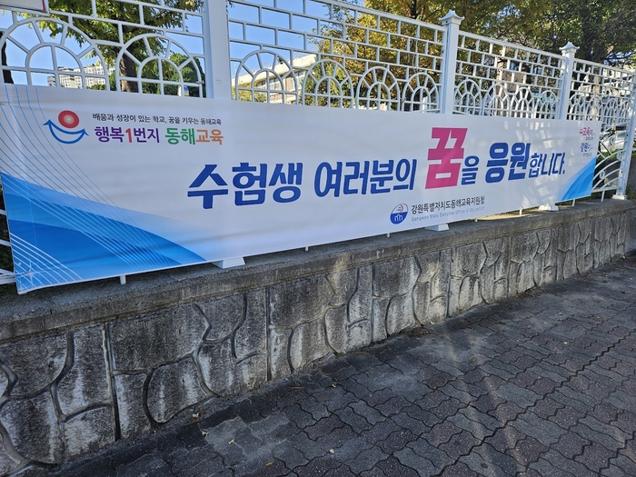 [스포츠서울ㅣ김기원기자]강원특별자치도동해교육지원청(교육장 서순원)은 7일(목) 동해교육지원청 및 관내 고등학교 6개소에 2025학년도 대학수학능력시험을 치르는 수험생을 응원하는 현수막을 게시했다.