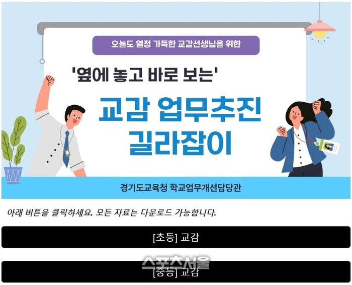〔스포츠서울│수원=좌승훈기자〕경기도교육청은 초·중·고등학교 교감과 부장교사의 업무를 지원하기 위해 ‘옆에 놓고 바로 보는, 업무추진 길라잡이’ 6종을 개발했다고 10일 밝혔다.