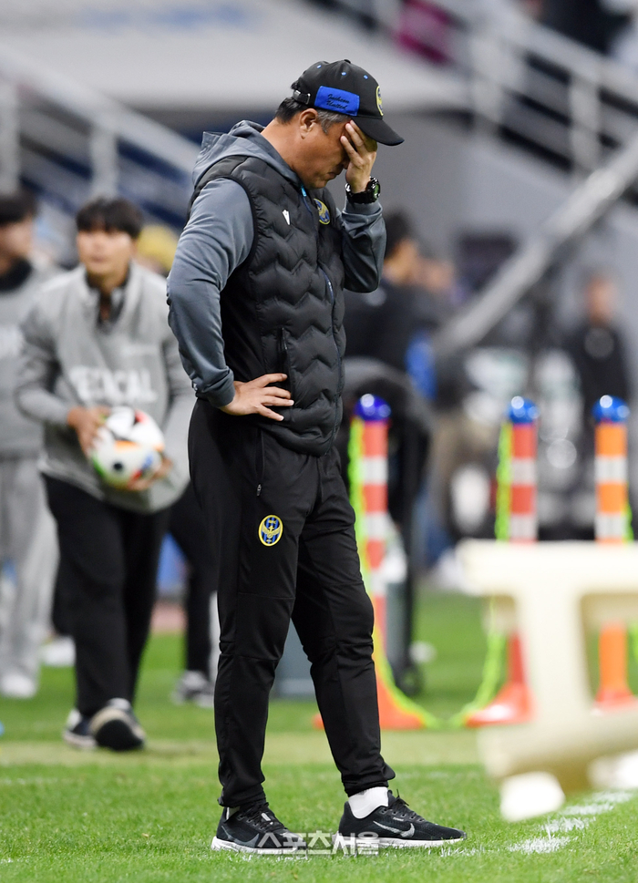 인천 유나이티드FC 최영근 감독이 10일 인천 축구전용경기장에서 열린 하나은행 K리그1 2024 대전 하나 시티즌과의 경기에서 1-2로 패하며 리그 최하위로 2부 리그 강등이 확정된 뒤 아쉬워하고 있다. 2024. 11. 10.