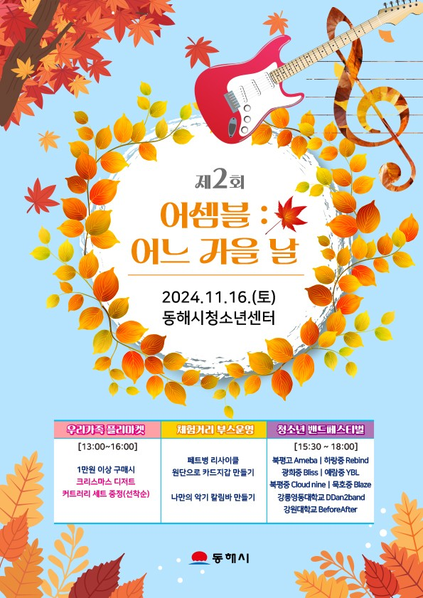 [스포츠서울ㅣ김기원기자]동해시(시장 심규언)는 오는 16일(토) 청소년센터에서 밴드페스티벌 ‘제2회 어셈블: 어느 가을 날’을 개최한다고 밝혔다.