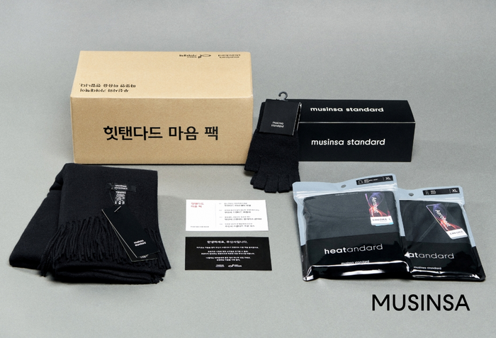 이번 ‘힛탠다드 마음 팩’은 무신사 스탠다드의 발열내의인 ‘힛탠다드’ 이너웨어 상하의 세트로 구성된다. 또 무신사 스탠다드에서 판매 중인 △머플러 △핑거리스 니트 글러브 △크루 삭스 등 겨울철 추위를 이겨내는 데에 도움이 될 만한 방한 아이템도 포함된다.